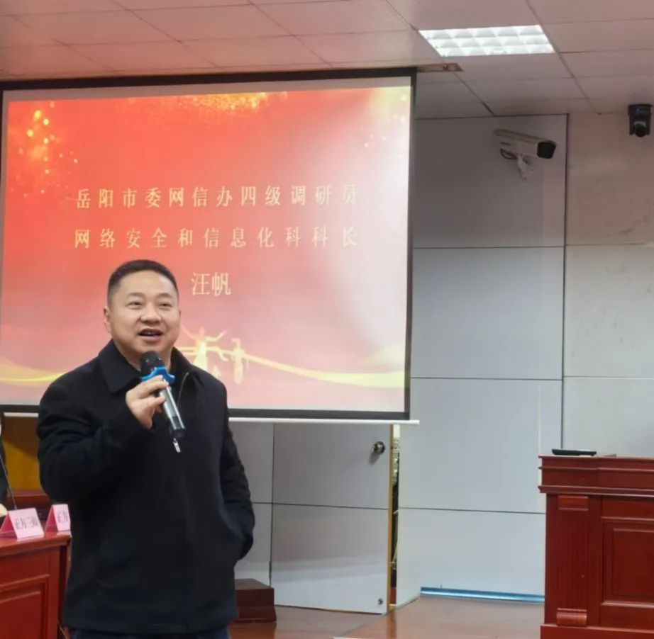岳阳市委网信办四级调研员、网络安全和信息化科科长汪帆为比赛冠军队伍颁奖